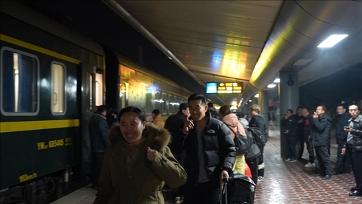 14號(hào)車(chē)廂內(nèi),來(lái)自黑龍江省齊齊哈爾市泰來(lái)縣的王興海和陳玉倩望著車(chē)窗外、站臺(tái)上的王靚怡,喜笑顏開(kāi)。跨越2700多公里、歷時(shí)52個(gè)小時(shí),只為給女兒一個(gè)驚喜,陪她在崗過(guò)年。