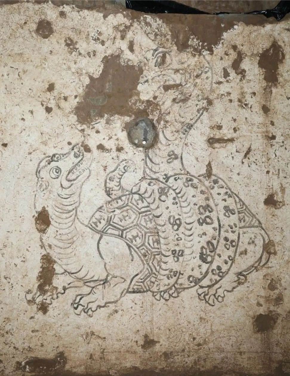 墓道處壁畫保存較差,僅墓道口處保留有少量畫面,兩壁分別為青龍、白虎圖樣;甬道兩側(cè)分別繪有三個(gè)侍女,僅存下半身;墓室東壁為樂舞圖,呈三段式布局,其中南側(cè)為十人組成的樂隊(duì),中部為女舞者,北部為觀看的貴婦(應(yīng)為墓主)及侍女;墓室北壁東側(cè)中心為一坐于方形高背扶手椅貴婦(應(yīng)為墓主),兩側(cè)站立有侍女,應(yīng)為表現(xiàn)墓主日常生活場(chǎng)景;墓室北壁西側(cè)為玄武圖,形象巨大,十分靈動(dòng);墓室西壁為六扇屏花草,畫面簡(jiǎn)單且潦草;墓室南壁為朱雀,呈雙翅展開欲騰飛狀。該墓壁畫布局充實(shí)完整,畫面惟妙惟肖,內(nèi)容上有一定程度反映了墓主生前生活,體現(xiàn)出墓主情趣高雅,深居簡(jiǎn)出,柔貞以靜好,有美婦之懿烈兼瞿母之慈仁。墓葬壁畫整體上風(fēng)格及年代與讓皇帝李憲墓極為相近,或?yàn)楣灿靡环郾舅L制。