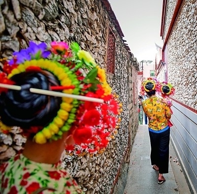 暢游在蟳埔村,除了一座座“流動的花園”,當?shù)氐奶厣窬右参瞬簧儆慰婉v足觀看。簪好花的游客們,很多會來到蚵殼厝旁邊拍照留念,五彩的花圍伴著紅白相間的蚵殼墻,有種原生態(tài)的民俗美。