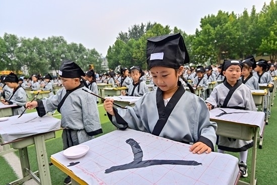2023年9月1日,山東濰坊,青州市云門山路回民小學,一年級新生用毛筆書寫“人”字。視覺中國供圖