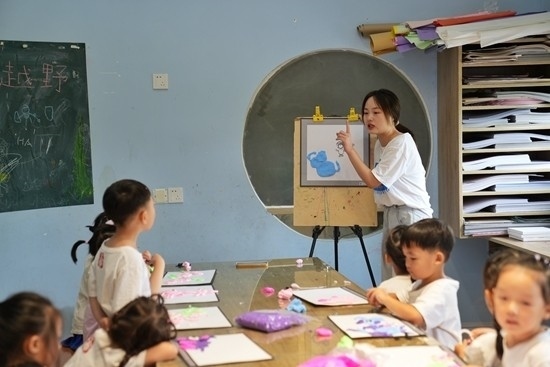 2022年7月21日,江西一幼兒園里的孩子在老師的指導下練習繪畫。視覺中國供圖