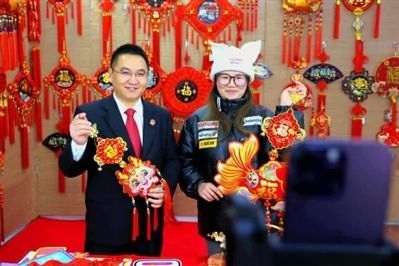 紅花法庭庭長栗瑞(左)在中國結(jié)電商直播間客串主播,既“帶貨”又普法。