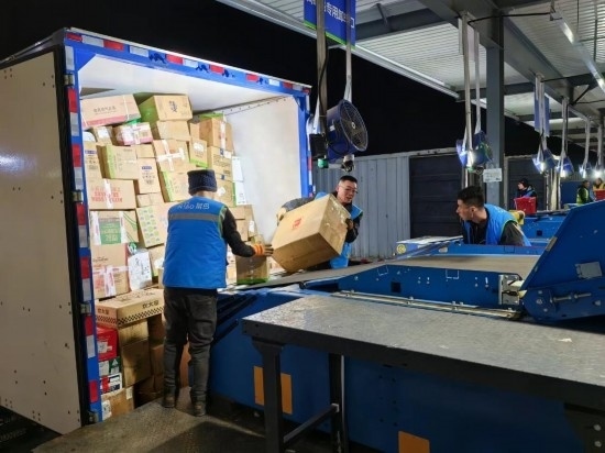 2月8日,菜鳥速遞北京順義二級分撥中心,工作人員正在卸車。新華社記者 魏弘毅攝