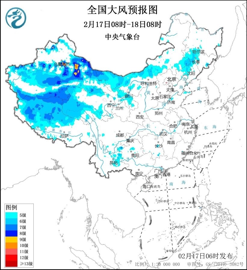 中央氣象臺(tái)2月17日06時(shí)繼續(xù)發(fā)布大風(fēng)藍(lán)色預(yù)警: