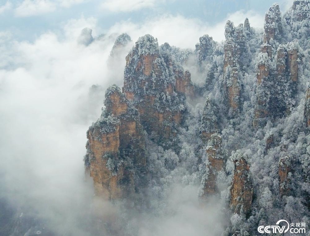 湖南張家界現(xiàn)霧凇景觀,云??澙@“仙氣飄飄”。