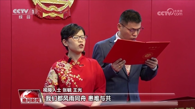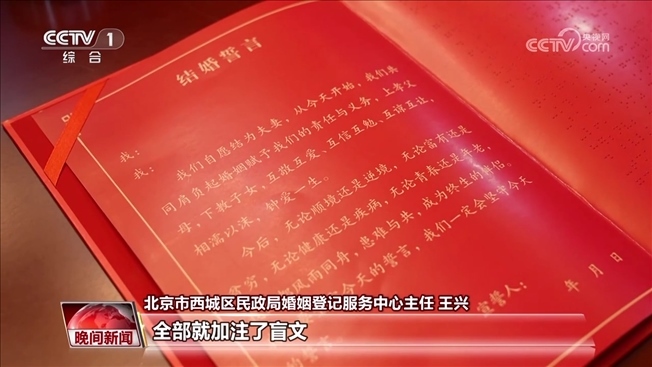 北京市西城區(qū)民政局婚姻登記服務(wù)中心主任 王興:我們通過這次活動(dòng)也是跟盲文出版社正式把這個(gè)結(jié)婚登記的告知單,還有結(jié)婚誓言,全部就加注了盲文,等以后再有相同需求的殘疾人到我們婚姻登記(服務(wù)中心)登記結(jié)婚,我們會(huì)給他們提供一套相應(yīng)的流程。
