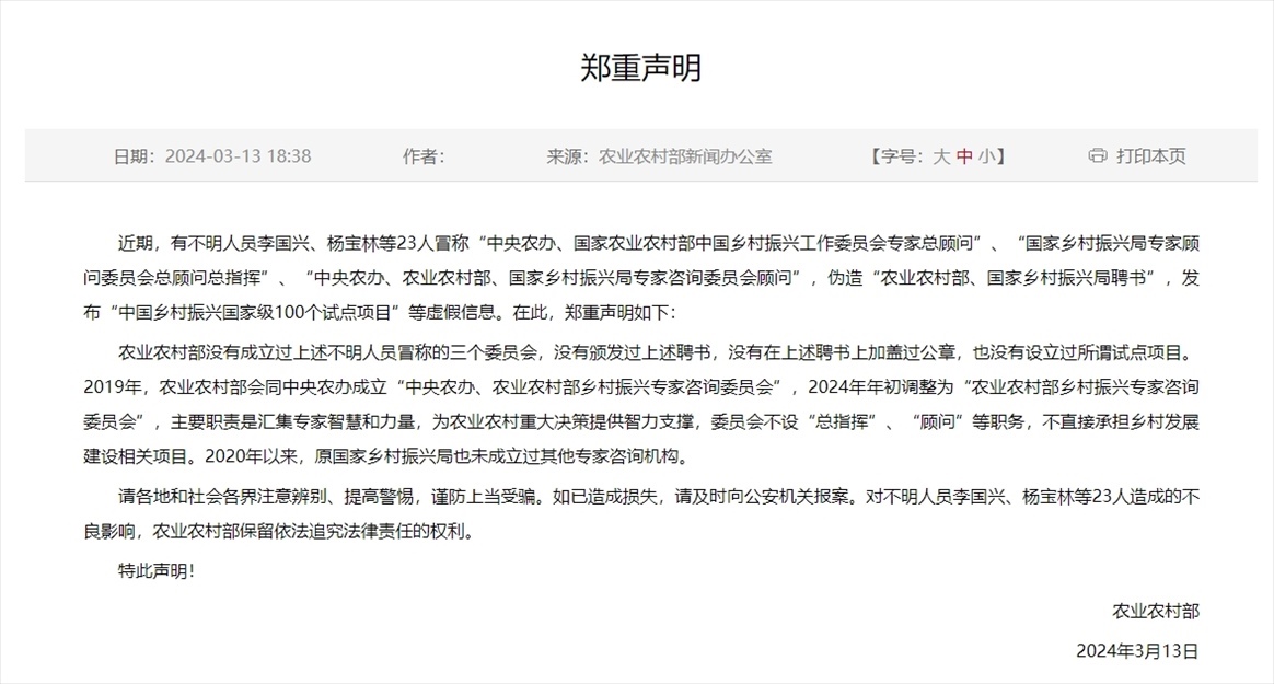 ·農(nóng)業(yè)農(nóng)村部鄭重聲明:沒(méi)有成立過(guò)不明人員冒稱的“中央農(nóng)辦、國(guó)家農(nóng)業(yè)農(nóng)村部中國(guó)鄉(xiāng)村振興工作委員會(huì)專家總顧問(wèn)”、“國(guó)家鄉(xiāng)村振興局專家顧問(wèn)委員會(huì)總顧問(wèn)總指揮”、“中央農(nóng)辦、農(nóng)業(yè)農(nóng)村部、國(guó)家鄉(xiāng)村振興局專家咨詢委員會(huì)顧問(wèn)”三個(gè)委員會(huì),沒(méi)有頒發(fā)過(guò)上述聘書,沒(méi)有在上述聘書上加蓋過(guò)公章,也沒(méi)有設(shè)立過(guò)所謂試點(diǎn)項(xiàng)目。