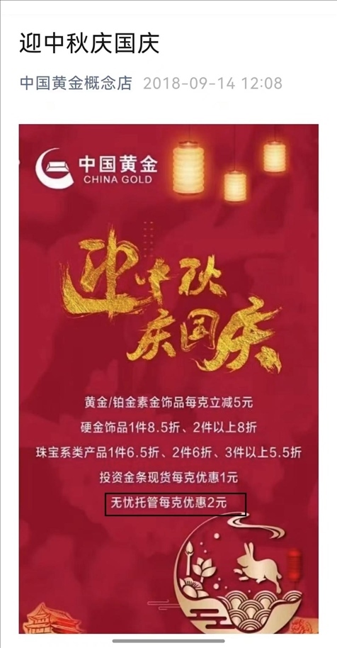 2018年,涉事門店的公眾號仍在宣傳無憂托管業(yè)務(wù),消費(fèi)者質(zhì)疑中國黃金方面,為何沒有發(fā)現(xiàn)這家店經(jīng)營公司禁止的業(yè)務(wù)/受訪者供圖