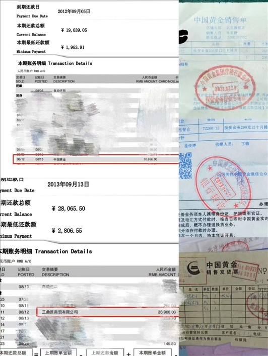 王鑫民:09年時候,他們跟順義那邊就有一個中國黃金店,就賣投資的黃金。我們想說買點(diǎn),將來自個老了以后能有一保證。他說,你要能寄存到這兒,還能給你點(diǎn)小禮品,我們想挺好的,你擱家多不安全,這么貴重的東西,我們就擱他那了,他給我們開單子。后來,順義這店搬到雙井去了,這是中國黃金的,而且商場更大,誰不都得放心。我們想跟他們也熟了,每年有點(diǎn)兒錢就買一點(diǎn)兒,還安全,還有點(diǎn)小獎品,左一回買右一回買的,他店員都認(rèn)得我們了,挺熟的。他突然給我們打電話說:這出事了,你們趕緊過來。