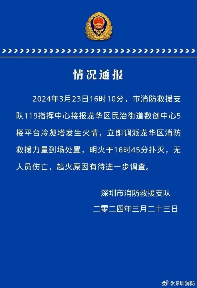 央視網(wǎng)消息:深圳市消防救援支隊發(fā)布情況通報,2024年3月23日16時10分,市消防救援支隊119指揮中心接報龍華區(qū)民治街道數(shù)創(chuàng)中心5樓平臺冷凝塔發(fā)生火情,立即調派龍華區(qū)消防救援力量到場處置,明火于16時45分撲滅,無人員傷亡,起火原因有待進一步調查。