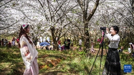 3月25日,游客在貴州省貴安新區(qū)櫻花園拍照留念。