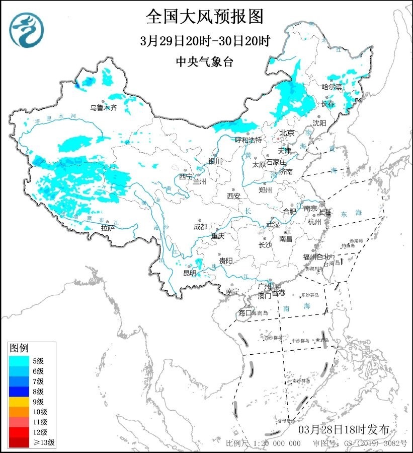 中央氣象臺3月28日18時繼續(xù)發(fā)布大風藍色預警: