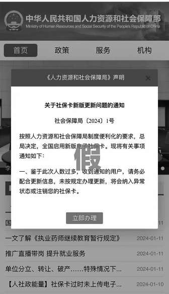 套路二 仿冒人力資源和社會(huì)保障部官網(wǎng),并在仿冒網(wǎng)站上設(shè)置釣魚網(wǎng)頁(yè),誘騙當(dāng)事人填寫姓名、身份證號(hào)等信息,再利用竊取的個(gè)人信息實(shí)施詐騙。持卡人在收到類似詐騙短信時(shí),可通過(guò)撥打12333服務(wù)熱線或前往人社服務(wù)大廳核實(shí)等方式,確認(rèn)社??顟B(tài)是否正常。