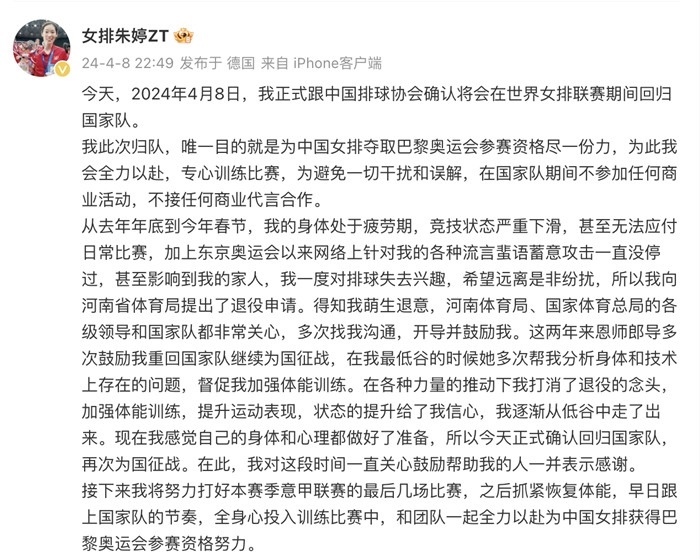 ·中國(guó)女排名將朱婷發(fā)文稱,將會(huì)在世界女排聯(lián)賽期間回歸國(guó)家隊(duì)。