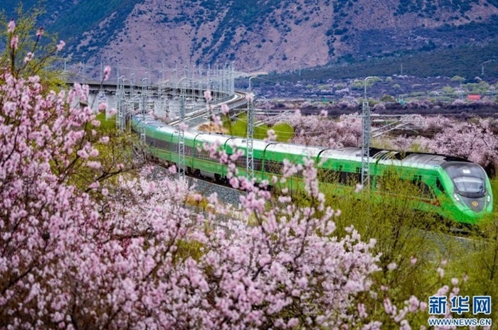 雪域高原桃花開(kāi),復(fù)興號(hào)上賞春光。拉林鐵路的車票,猶如一張賞花請(qǐng)柬,吸引了眾多游客前來(lái)雪域高原賞桃花。