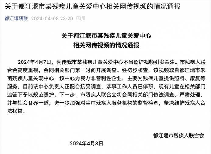 ·都江堰一康復(fù)中心殘障兒童被老師打罵?官方通報(bào):涉事人員已停職。