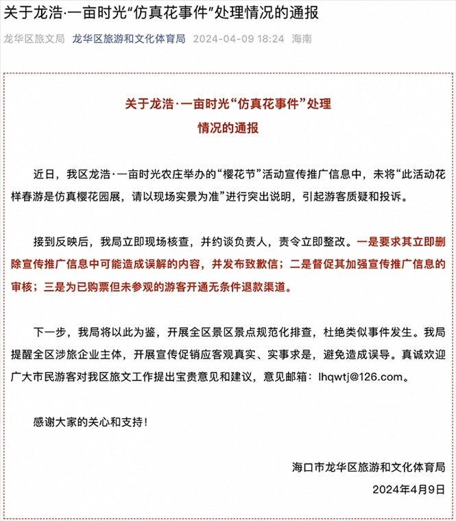 ·??谝晦r(nóng)莊辦“櫻花節(jié)”樹(shù)上全是假花?官方通報(bào):約談責(zé)任人,責(zé)令立即整改。