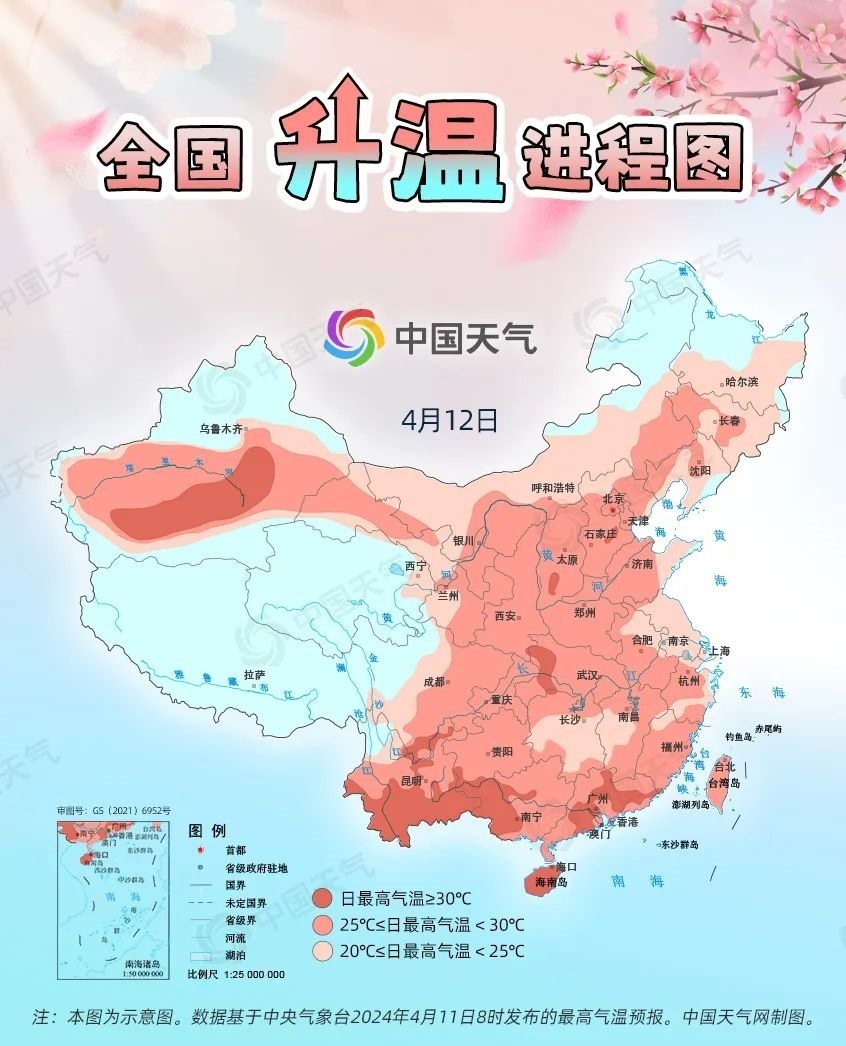 眼下,全國大部處于冷空氣影響間歇期,升溫是主旋律。預(yù)計(jì)今起三天(4月11日至13日),我國從北到南都將開啟回暖進(jìn)程,最高氣溫25℃以上的區(qū)域幾乎覆蓋整個(gè)中東部,波及20余省份,東北、西北地區(qū)氣溫將大面積創(chuàng)今年以來新高,北方不少地方還會(huì)體驗(yàn)到常年5月中旬才有的超前暖熱。中國天氣網(wǎng)推出全國升溫進(jìn)程圖,看看哪些地方將沖擊30℃。