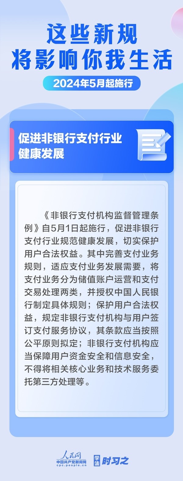 促進非銀行支付行業(yè)健康發(fā)展;首次對社會組織名稱進行統(tǒng)一規(guī)定;破除資格預(yù)審等招投標(biāo)領(lǐng)域交易壁壘……5月起,這些新規(guī)施行,將影響你我生活。