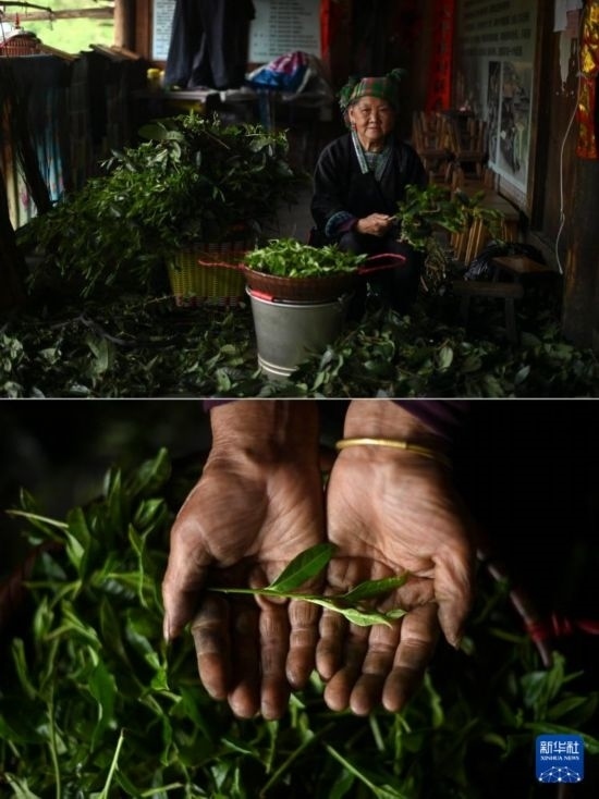 在廣西柳州市融水苗族自治縣桿洞鄉(xiāng)黨鳩村,72歲的梁妹花老人在整理剛剛采摘的茶葉(4月11日攝,拼版照片)。油茶是當(dāng)?shù)氐膫鹘y(tǒng)飲品,梁妹花每天都要打油茶。