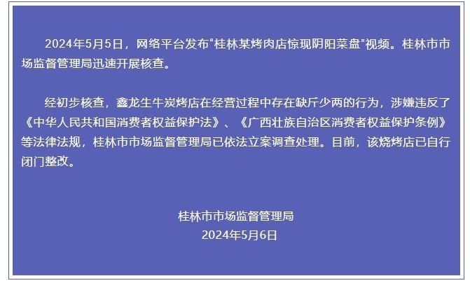 經(jīng)初步核查,鑫龍生牛炭烤店在經(jīng)營過程中存在缺斤少兩的行為,涉嫌違反了《中華人民共和國消費者權(quán)益保護法》、《廣西壯族自治區(qū)消費者權(quán)益保護條例》等法律法規(guī),桂林市市場監(jiān)督管理局已依法立案調(diào)查處理。目前,該燒烤店已自行閉門整改。