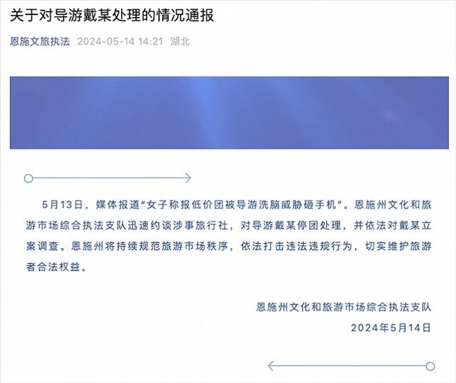 央視網(wǎng)消息:湖北恩施州文化和旅游市場(chǎng)綜合執(zhí)法支隊(duì)5月14日通報(bào),5月13日,媒體報(bào)道“女子稱報(bào)低價(jià)團(tuán)被導(dǎo)游洗腦威脅砸手機(jī)”。恩施州文化和旅游市場(chǎng)綜合執(zhí)法支隊(duì)迅速約談涉事旅行社,對(duì)導(dǎo)游戴某停團(tuán)處理,并依法對(duì)戴某立案調(diào)查。恩施州將持續(xù)規(guī)范旅游市場(chǎng)秩序,依法打擊違法違規(guī)行為,切實(shí)維護(hù)旅游者合法權(quán)益。