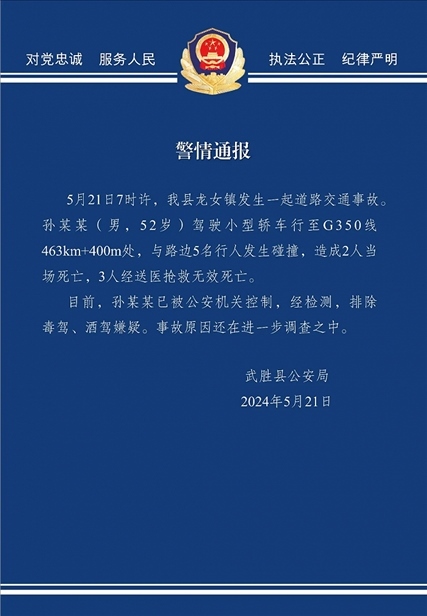 央視網(wǎng)消息:據(jù)平安武勝微信公眾號消息,5月21日7時許,武勝縣龍女鎮(zhèn)發(fā)生一起道路交通事故,孫某某(男,52歲)駕駛小型轎車行至G350線463km+400m處,與路邊5名行人發(fā)生碰撞,造成2人當(dāng)場死亡,3人經(jīng)送醫(yī)搶救無效死亡。目前,孫某某已被公安機(jī)關(guān)控制,經(jīng)檢測,排除毒駕、酒駕嫌疑。事故原因還在進(jìn)一步調(diào)查之中。