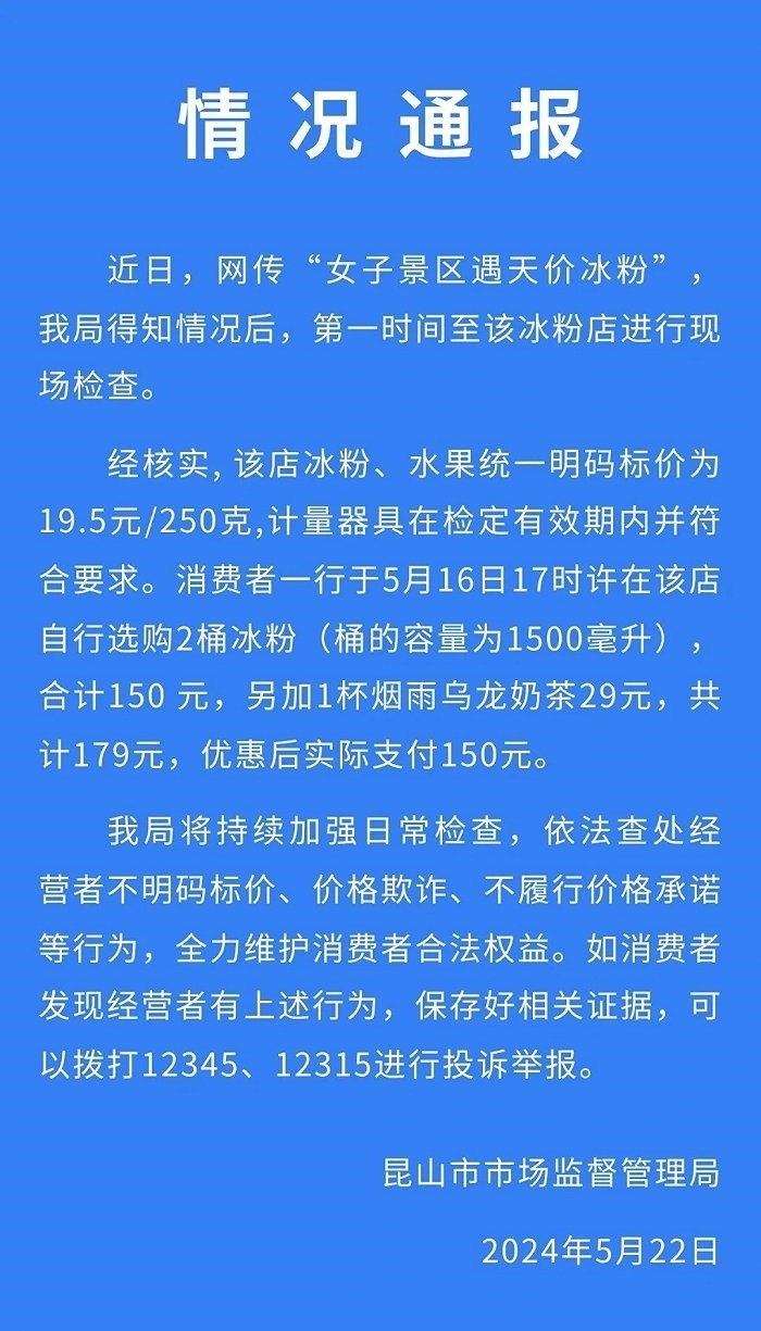 央視網(wǎng)消息:5月22日,江蘇昆山市市場(chǎng)監(jiān)督管理局發(fā)布情況通報(bào):近日,網(wǎng)傳“女子景區(qū)遇天價(jià)冰粉”,我局得知情況后,第一時(shí)間至該冰粉店進(jìn)行現(xiàn)場(chǎng)檢查。經(jīng)核實(shí),該店冰粉、水果統(tǒng)一明碼標(biāo)價(jià)為19.5元/250克,計(jì)量器具在檢定有效期內(nèi)并符合要求。消費(fèi)者一行于5月16日17時(shí)許在該店自行選購(gòu)2桶冰粉(桶的容量為1500毫升),合計(jì)150元,另加1杯煙雨烏龍奶茶29元,共計(jì)179元,優(yōu)惠后實(shí)際支付150元。