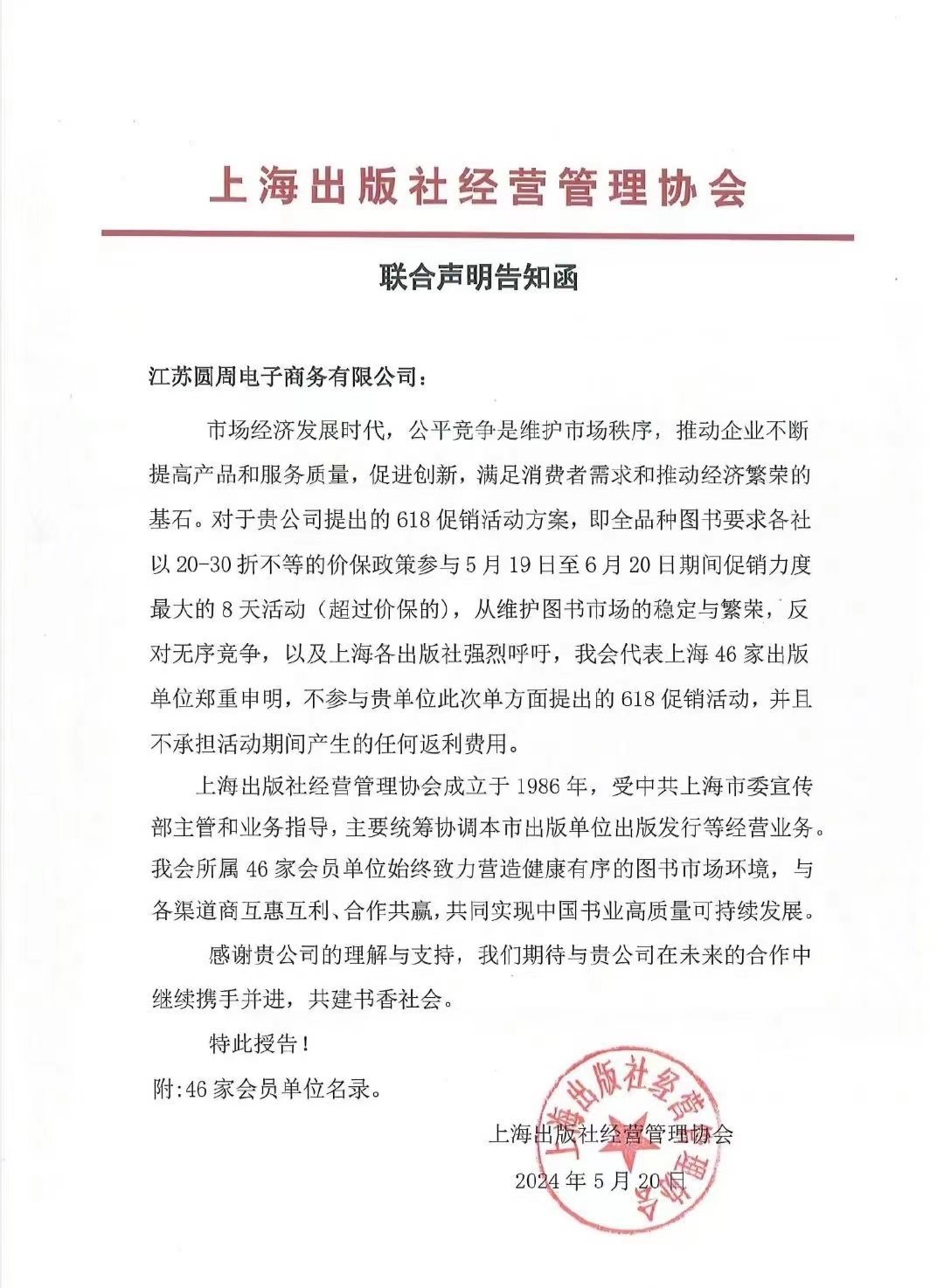 上海的46家出版社以上海出版社經(jīng)營管理協(xié)會(huì)的名義聯(lián)合聲明退出京東618促銷