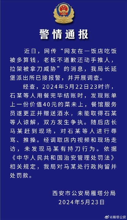 ·網(wǎng)友稱(chēng)在飯店吃飯被多算錢(qián)還遭威脅,西安雁塔警方通報(bào)。