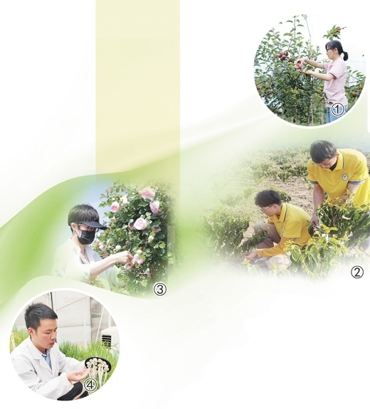 圖①:劉丹丹在調(diào)查蘋果病害情況。 圖②:咖啡團隊的學(xué)生們在咖啡田地里進行花芽分化調(diào)查。 圖③:周寧寧在進行月季雜交授粉。 圖④:雷貴杰在觀察水稻根系的生長狀況。以上圖片均為受訪者提供