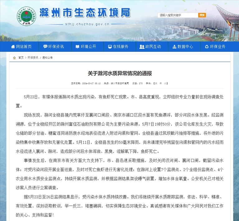 現(xiàn)場發(fā)現(xiàn),滁河全椒縣境內(nèi)荒草圩至襄河口閘段、南京市浦口區(qū)段水面有死魚漂浮,部分河段水體發(fā)黑。經(jīng)監(jiān)測溯源,位于全椒經(jīng)開區(qū)的滁州富信石油助劑有限公司為主要污染來源。5月7日19時50分,該公司倉庫發(fā)生火災(zāi),導(dǎo)致倉儲的部分甘油、糖蜜連同消防廢水經(jīng)地表徑流進(jìn)入附近溝渠和管網(wǎng)。全椒縣通過筑壩截污抽排等措施,將外泄的污染物集中收集存放和無害化處置。5月11日,全椒縣發(fā)生約50毫米降雨,尚未清理完畢殘留在溝渠和管網(wǎng)內(nèi)的污水經(jīng)雨水徑流進(jìn)入襄河、滁河,造成部分河段水體渾濁、黑臭,溶解氧下降,魚蝦死亡。公安機(jī)關(guān)已對相關(guān)涉案人員進(jìn)行立案調(diào)查。