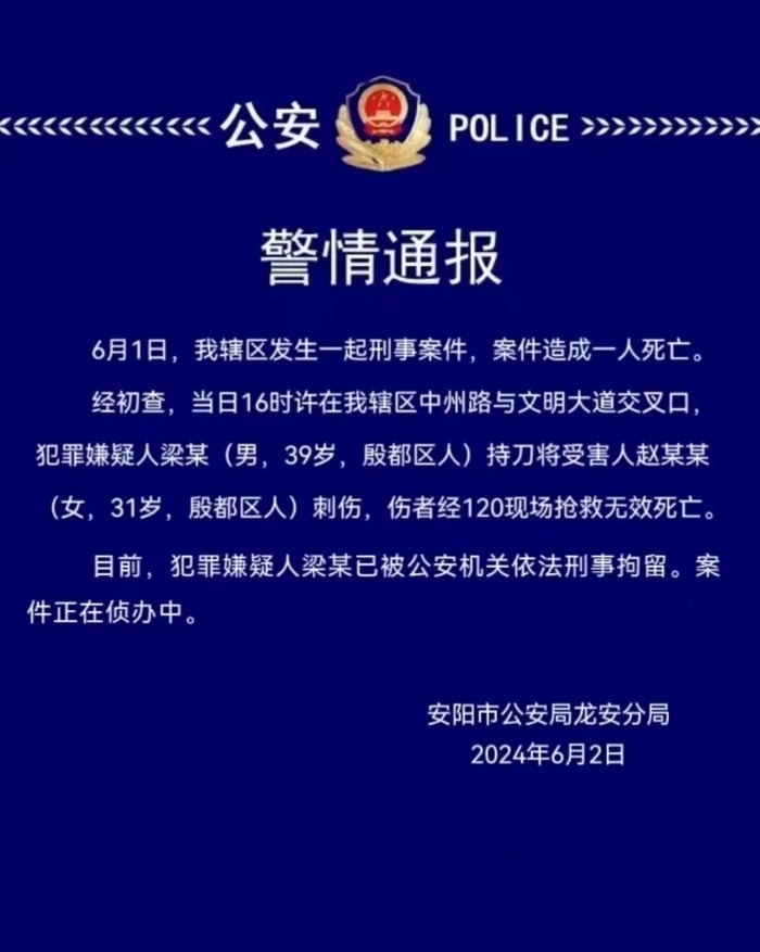 央視網(wǎng)消息:河南安陽市公安局龍安分局6月2日發(fā)布警情通報:6月1日,轄區(qū)發(fā)生一起刑事案件,案件造成一人死亡。經(jīng)初查,當(dāng)日16時許在轄區(qū)中州路與文明大道交叉口,犯罪嫌疑人梁某 (男,39歲,殷都區(qū)人)持刀將受害人趙某某(女,31歲,殷都區(qū)人)刺傷,傷者經(jīng)120現(xiàn)場搶救無效死亡。目前,犯罪嫌疑人梁某已被公安機(jī)關(guān)依法刑事拘留。案件正在偵辦中。