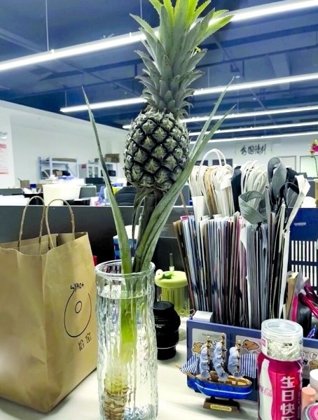00后楊三日從事新媒體運(yùn)營(yíng)工作,她在工位上養(yǎng)了一個(gè)菠蘿,“養(yǎng)菠蘿是一件很酷的事情,不僅能觀賞,還能吃,很配我特立獨(dú)行的氣質(zhì)?!彼f自從養(yǎng)了菠蘿之后,每天上班時(shí)心情就變得非常好?!拔业墓の痪拖駸釒в炅忠粯?,提前進(jìn)入了春天?!?/p>