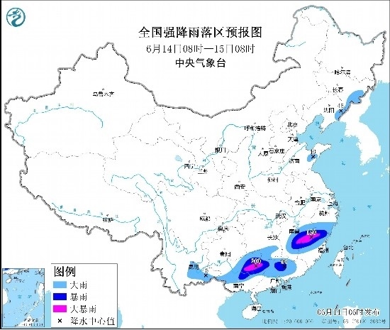 圖1 全國強降雨落區(qū)預(yù)報圖(6月14日08時-15日08時)