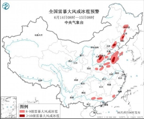圖2 全國雷暴大風或冰雹預(yù)警圖(6月14日08時-15日08時)