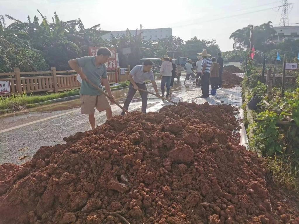 在梧州市長(zhǎng)洲區(qū)長(zhǎng)洲鎮(zhèn)泗洲村,村民在低水位路段加固堤防。(受訪(fǎng)者供圖)