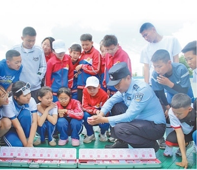 內蒙古自治區(qū)通遼市科爾沁左翼后旗公安局禁毒大隊民警走進該旗蒙古族實驗小學,向學生們展示“笑氣”模型。周連龍攝