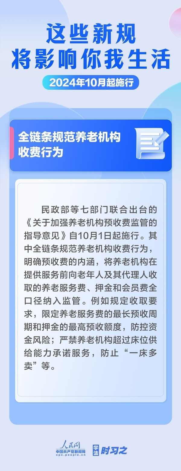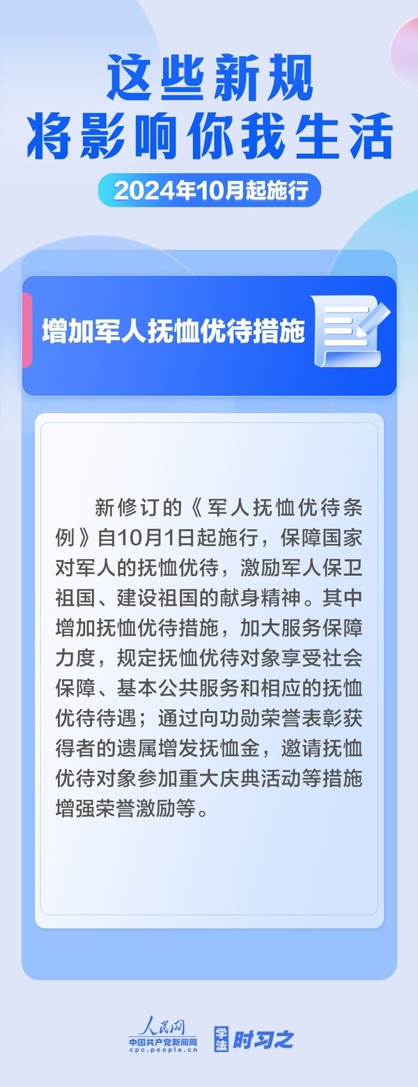 增加軍人撫恤優(yōu)待措施;全鏈條規(guī)范養(yǎng)老機(jī)構(gòu)收費(fèi)行為;電動自行車用鋰電池實(shí)施強(qiáng)制性產(chǎn)品認(rèn)證……10月起,這些新規(guī)施行,將影響你我生活。