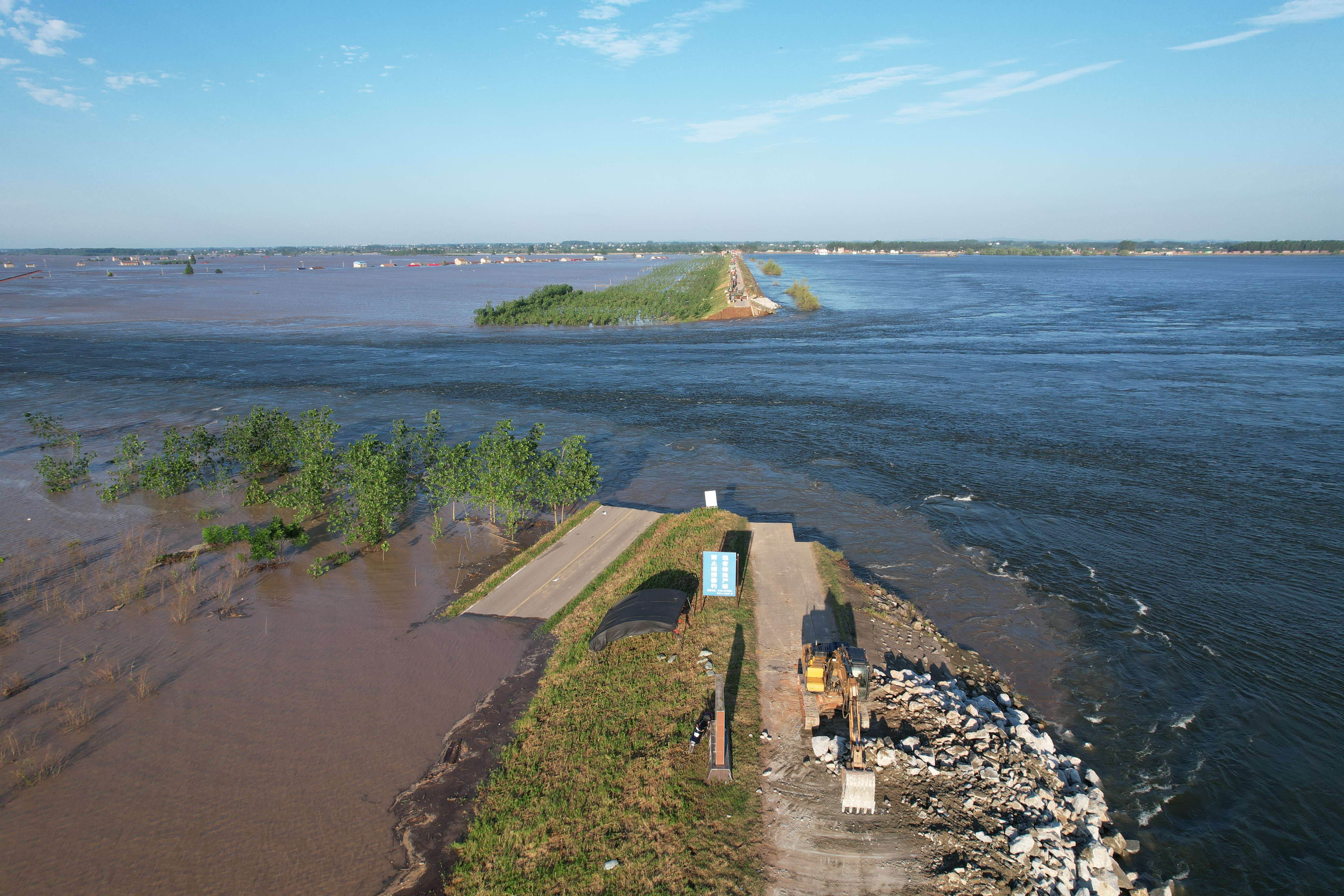 目前,前線正加緊組織工程機(jī)械加緊施工,在決口兩端建設(shè)4個(gè)倒車平臺(tái),并在決口兩端傾倒大型石塊,建設(shè)‘裹頭’,減緩水流對(duì)決口沖刷,防止決口擴(kuò)大。
