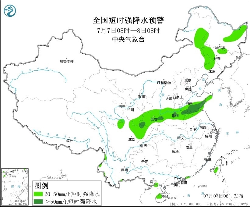 預(yù)計7月7日08時至8日08時,內(nèi)蒙古東北部、黑龍江東北部和西南部、吉林北部、青海東南部、甘肅東南部、陜西南部、山西西南部、山東南部、河南中部、安徽北部、江蘇北部、四川北部、重慶西部等地的部分地區(qū)將有8級以上雷暴大風(fēng)或冰雹天氣,其中,山東南部、河南東部、安徽北部、江蘇北部等地的部分地區(qū)將有10級以上雷暴大風(fēng),最大風(fēng)力可達11級以上;內(nèi)蒙古東部、黑龍江中東部、吉林中西部、遼寧北部、甘肅東南部、陜西中南部、山西南部、山東中南部、河南中北部、安徽北部、江蘇北部、四川北部、海南島西北部、臺灣島西南部等地的部分地區(qū)將有小時雨量大于20毫米的短時強降水天氣,其中,陜西東南部、山東南部、河南中部、江蘇北部、四川盆地西北部等地的部分地區(qū)將有小時雨量大于50毫米,最大可達70毫米以上。