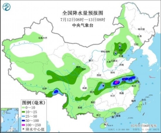 7月11日08時至12日08時,四川東北部、重慶中北部、湖北西部和北部、河南東南部、安徽中部、江蘇南部、上海以及西藏東南部、云南西部等地部分地區(qū)有大到暴雨,其中,安徽中部、江蘇西南部、重慶北部等地部分地區(qū)有大暴雨(100~170毫米)。內蒙古東南部和西北部、黑龍江東部、新疆東部、浙江中北部等地部分地區(qū)有4~6級風,其中,新疆東部部分地區(qū)有6~7級風。