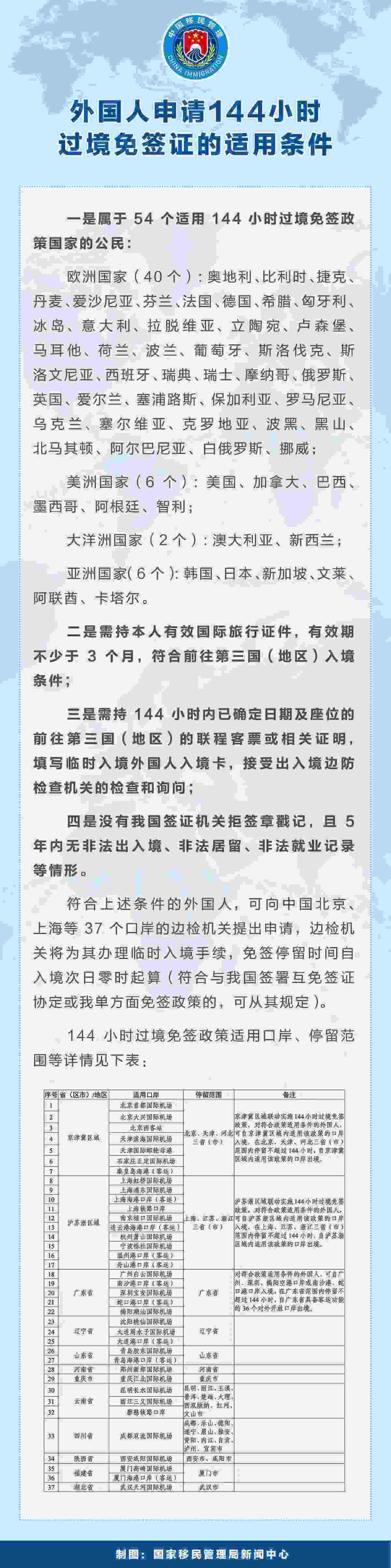 據(jù)了解,截至目前,國家移民管理局已在北京,天津,河北石家莊、秦皇島,遼寧沈陽、大連,上海,江蘇南京、連云港,浙江杭州、寧波、溫州、舟山,河南鄭州,廣東廣州、深圳、揭陽,山東青島,重慶,四川成都,陜西西安,福建廈門,湖北武漢,云南昆明、麗江、西雙版納等地的37個(gè)口岸實(shí)施144小時(shí)過境免簽政策。美國、加拿大、英國等54國公民持有效國際旅行證件和144小時(shí)內(nèi)確定日期及座位的聯(lián)程客票從上述口岸過境前往第三國(地區(qū)),可免辦簽證在規(guī)定區(qū)域內(nèi)停留不超過144小時(shí),停留期間可從事旅游、商務(wù)、訪問、探親等短期活動(dòng)(符合與我國簽署互免簽證協(xié)定或我單方面免簽政策的,可從其規(guī)定)。