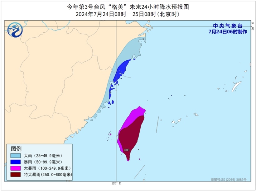 降水預報:7月24日08時至25日08時,浙江東南部、福建東部將有大到暴雨,臺灣島有大暴雨,部分地區(qū)特大暴雨(250-600毫米)。