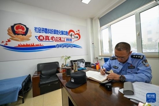 在天津市東麗區(qū)萬新派出所,平亞楠在記錄本上填寫調(diào)解情況記錄(9月30日攝)。