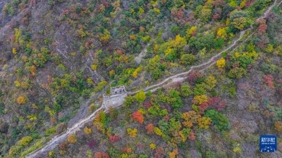 10月18日在河北省遷西縣上營(yíng)鎮(zhèn)青山關(guān)長(zhǎng)城景區(qū)拍攝的秋景(無人機(jī)照片)。