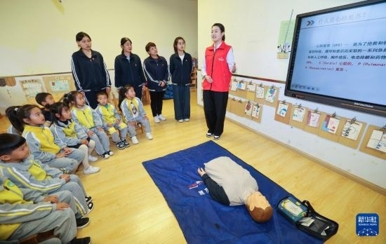 10月22日,國網(wǎng)浙江湖州供電公司“救”在身邊志愿服務隊的黨員志愿者梅月圓(右一)在長興縣開發(fā)區(qū)中心幼兒園開展應急救護培訓和急救知識普及。紅十字二級應急救護師梅月圓是應急救護培訓志愿者,也是浙江省三八紅旗手。