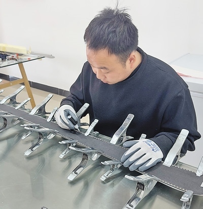 冰雪歡騰體育裝備科技(哈爾濱)有限公司內(nèi),工人為滑雪板底面邊刃涂膠加固。