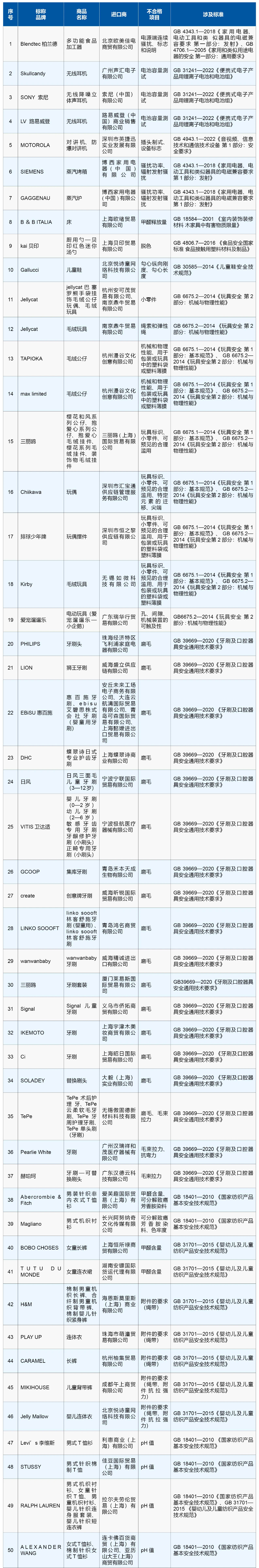 據(jù)海關總署介紹,不合格情況包括進口小家電電池容量測試、電器輻射發(fā)射項目不合格;進口玩具機械和物理性能、小零件項目不合格;進口服裝甲醛含量、可分解致癌芳香胺染料超標;進口家具甲醛釋放量超標;進口牙刷磨毛不合格等。