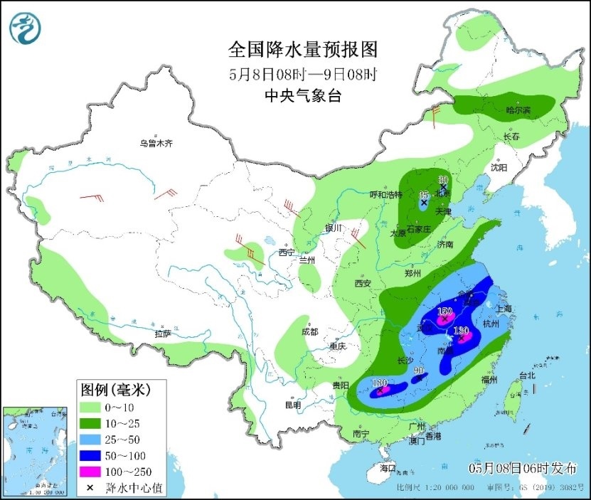 預(yù)計今天白天至夜間,江淮大部、江漢東部、江南西南部和中東部、華南北部以及華北東北部等地部分地區(qū)有大到暴雨,其中,安徽西南部、湖北東部、江西東北部、浙江西部、廣西北部等局地有大暴雨;上述部分地區(qū)伴有短時強(qiáng)降水、8級以上雷暴大風(fēng)或冰雹天氣等強(qiáng)對流天氣,其中,安徽西南部、湖北東部、湖南東部、江西中北部、廣西東北部等局地將有10級以上雷暴大風(fēng),最大風(fēng)力可達(dá)11級以上,江西北部等地局地不排除出現(xiàn)龍卷的可能性。